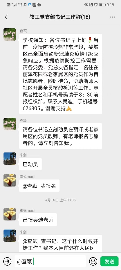 疫情就是命令,防控就是责任。tyc1286太阳集团紧急启动应急措施,在全校范围内招募党员教师,作为浙师大社区全员核酸检测的首批志愿者。凌晨5点,教师tyc1286太阳集团教工党支部书记工作群便发出了招募通知,教育技术学系教师党支部书记李鸣华老师第一个报名参加。