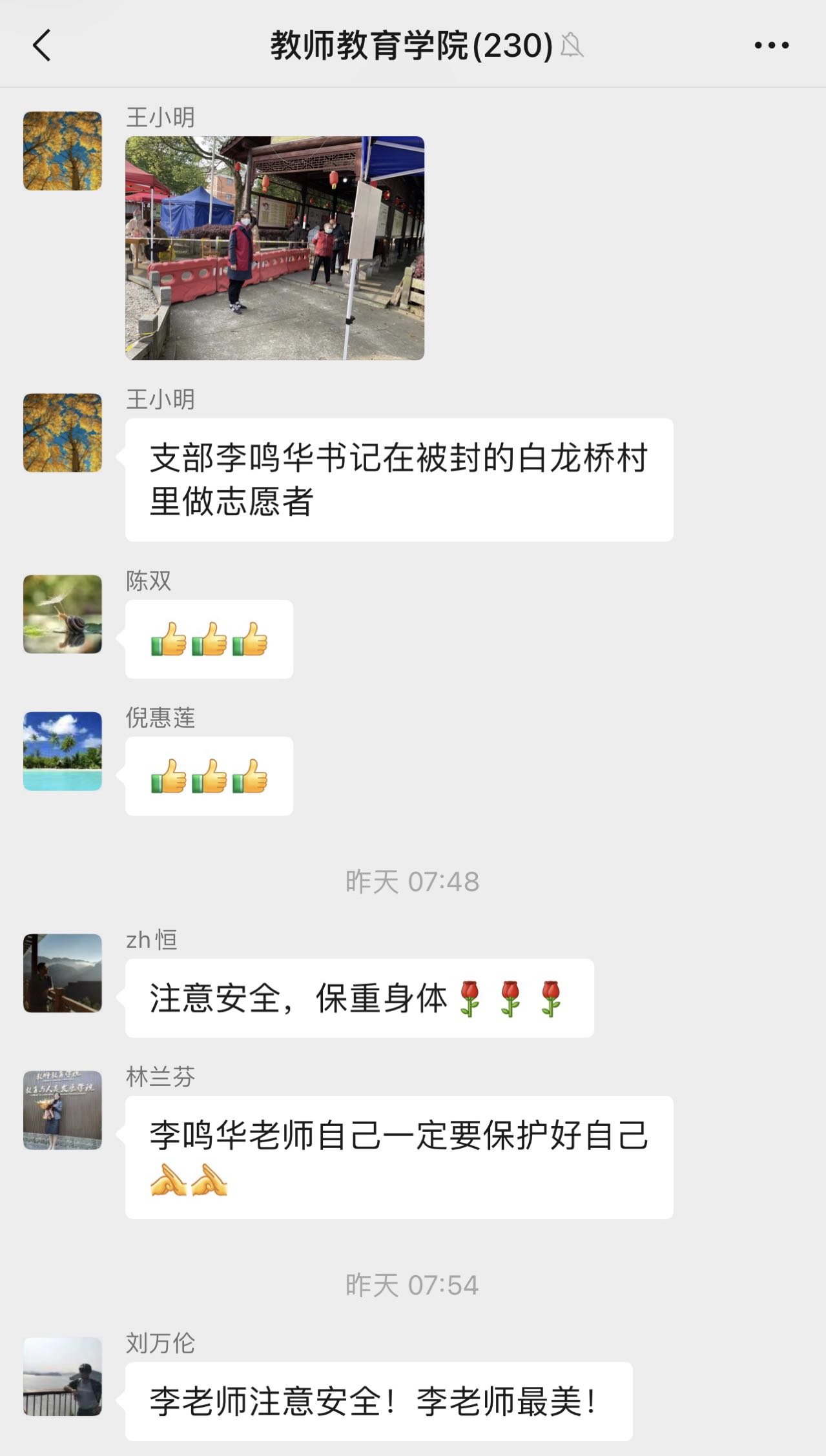作为教育技术学系教师党支部书记,虽然不在学校,李鸣华依旧每天在教工党支部书记工作群、新冠每日一报工作群、教育技术系的微信群、支委群等工作群中转发防疫信息,提醒每日健康打卡,商讨防疫工作等,事无巨细,认真周到。学院老师们在知道李鸣华老师的事迹后,纷纷给予诚挚的关心,为这最美支书点赞。学院党委书记查颖点赞李鸣华老师是“无愧于师大的好支书和最美浙师人”。