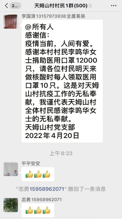 图为天姆山村党支部接收李鸣华老师第一批捐赠口罩12000只的感谢信