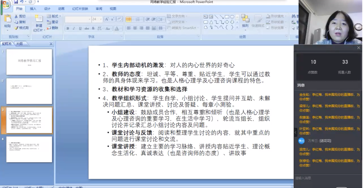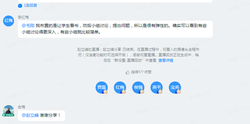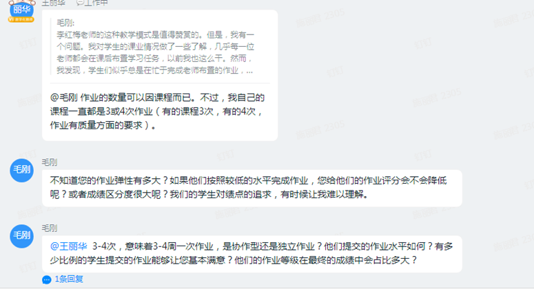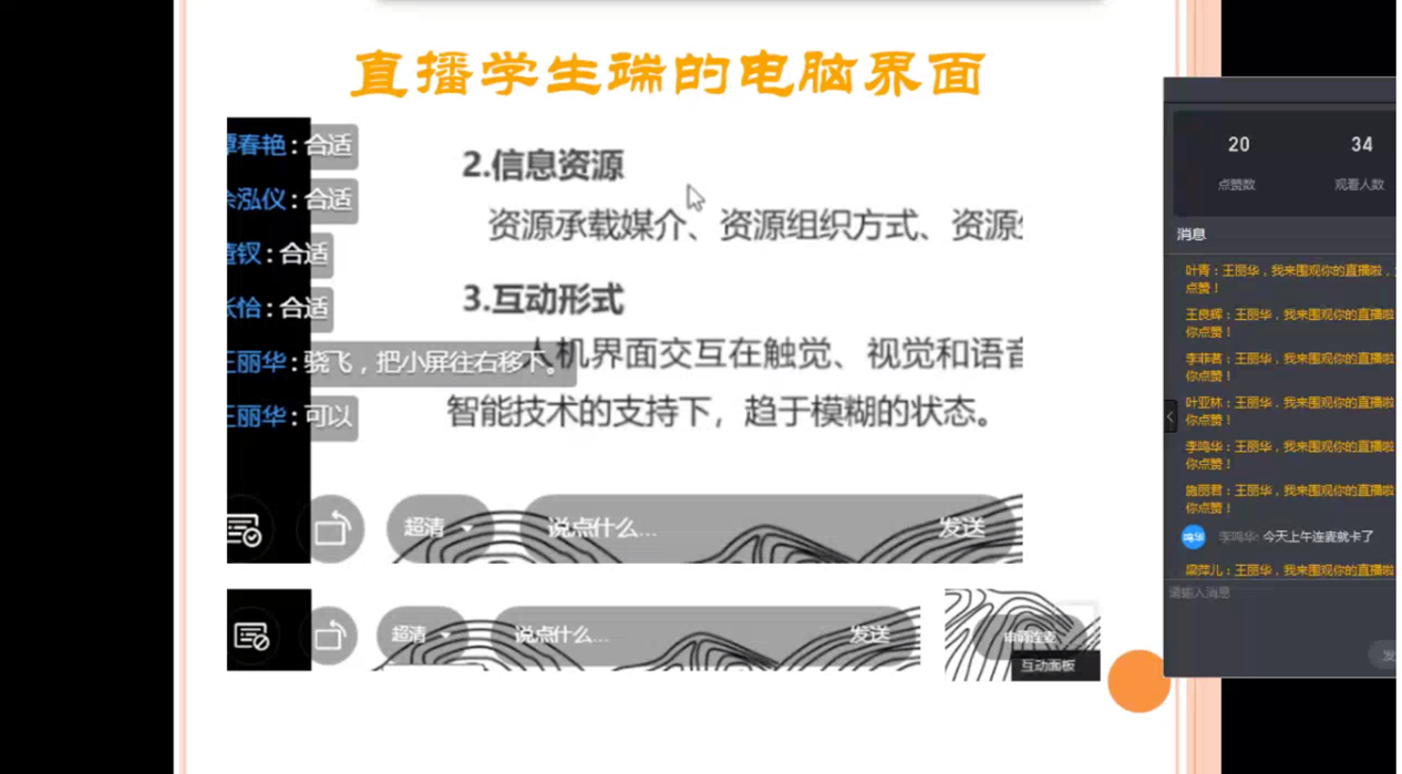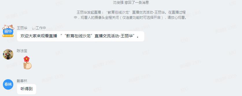 晚上7点58分,王丽华老师准时上线学院钉钉群,进行了“善用钉钉直播的不同功能”和“线上教学十五字”的主题内容分享。首先王老师通过PPT向其他老师展示了钉钉教师端电脑界面和学生端电脑界面的区别,介绍发起直播的步骤及露脸、白板、互动面板等功能选项。接下来王老师向大家介绍了自己“十五个字”的线上教学理念:一是“研需要”,了解在电脑端或手机端的同学需要什么、可能会做些什么,利用智能报表进行前测问卷调查;二是“明规则”,向学生明确计入线上学习成绩的课堂参与类型; 三是“优内容“,加强课程关联性、丰富性、参与性,课堂案例要精选,内容不宜过长,做到便于观看、比较、互动;四是“重形式”,因课程内容不同采用直播、视频会议等多种互动方式;五是“有反馈”,上课时的口头反馈、课后的书面反馈都是必不可少的。