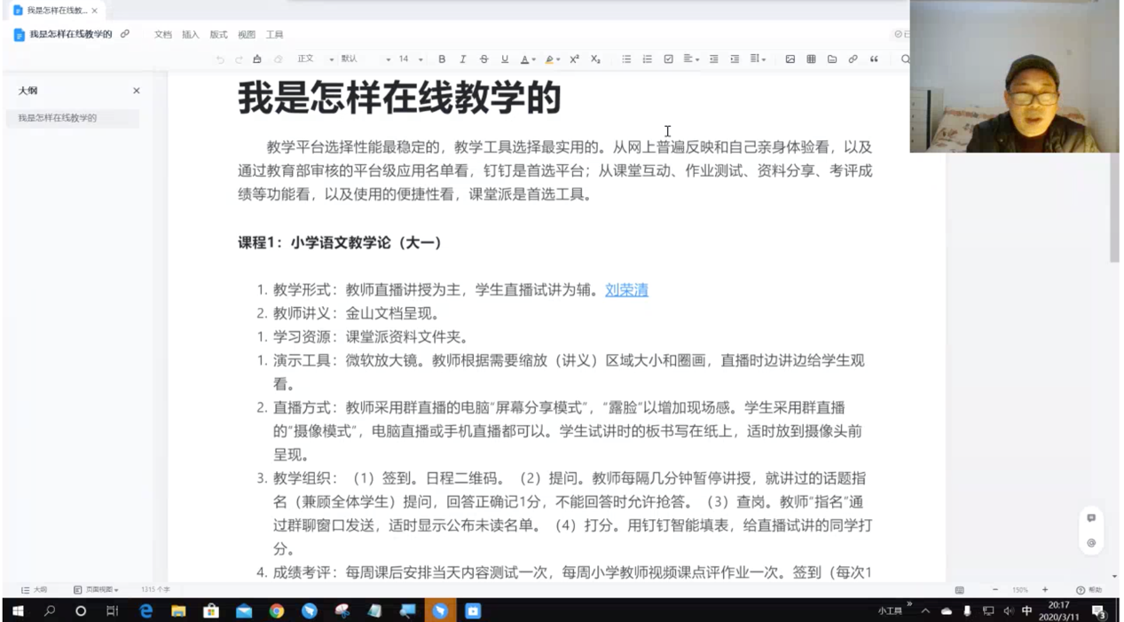 “教学平台选择性能最稳定的,教学工具选择最实用的。从网上普遍反映和自己亲身体验看,以及通过教育部审核的平台级应用名单看,钉钉是首选平台;从课堂互动、作业测试、资料分享、考评成绩等功能以及使用的便捷性看,课堂派是首选工具。”金楠老师选择钉钉和课堂派支撑他的线上教学。金老师的课程由教师直播讲授和学生直播试讲两部分组成,他选择金山文档来呈现教师讲义,将学习资源上传至课堂派资料文件夹,方便学生阅读。此外,他利用钉钉的日程二维码进行签到工作,上课时会不定时提问,确保学生认真听讲。在金老师的课上,学生模拟试讲是关键的一部分,他引导学生使用平台进行直播汇报,并利用钉钉智能报表让同学们相互评分。