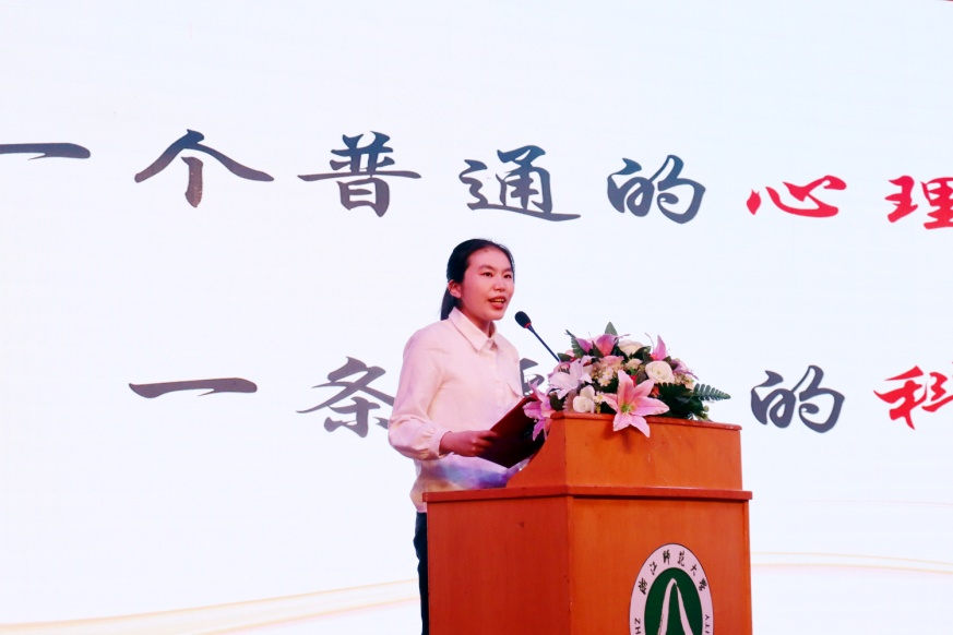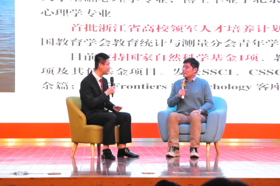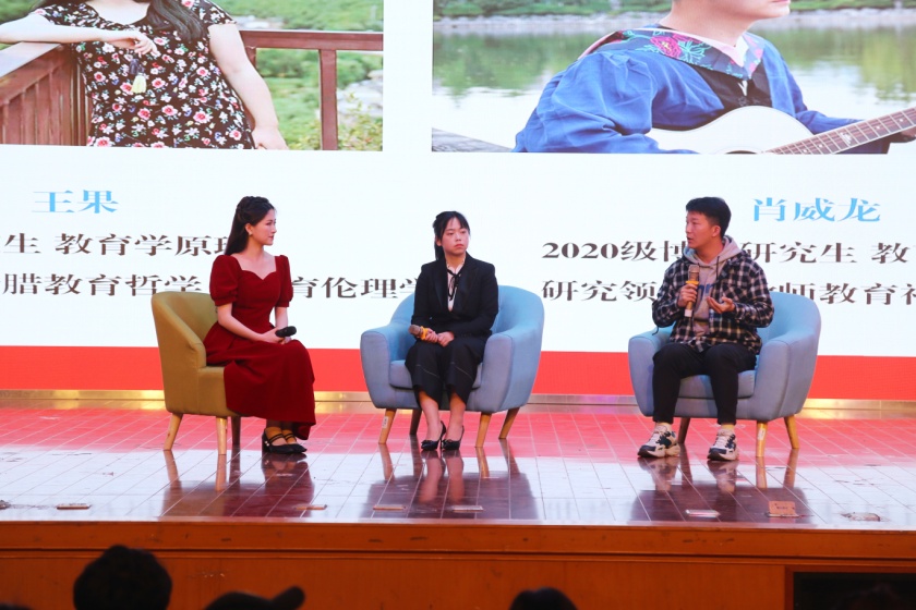 “我们渴望生活,我们渴望在天上飞。”由院主持队和院演讲队的同学们带来的诗歌朗诵《浙师底色》描绘了一幅学子们励学奋斗的图景,传递了教育星空下共同的精神和向往,拉开了第二篇章的帷幕。几位学生代表依次传述他们的经验和心得:本科生代表,来自应用心理学173班的潘艳方同学以个人讲述辅以情景剧展示的形式,展现了她与科研的故事,涵盖导师带她走上科研之路的经过以及她克服的三个挑战——心理测量、编程、数学;硕士生代表,来自教育技术学硕士生183班的景慧从青海长途跋涉来到东海之滨求学,怀着教育的热忱和反哺家乡的期盼,讲述和志同道合的朋友共同的故事以及创业成就背后的付出与收获;博士生代表,王果、肖威龙分别分享了他们的考博经历、读博感受和人生规划,解答了场下同学关于书籍推荐、导师帮助、考博准备等问题。