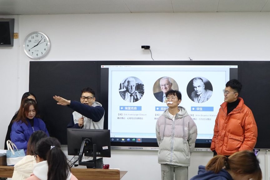 在开场导入环节,周文静和高雯雯两位心理委员请出由三位同学扮演的教育心理学大师并让他们分别开展自我介绍,以生动有趣的方式带同学们回顾了埃里克森、班杜拉、华生的相关知识,以此拉开心理班会的序幕。
